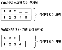 VARCHAR형은 저장할 문자열의 길이에 맞춰 저장공간을 가변적으로 사용하여 저장하는 반면 CHAR형은 언제나 고정된 길이로 데이터가 저장됨.